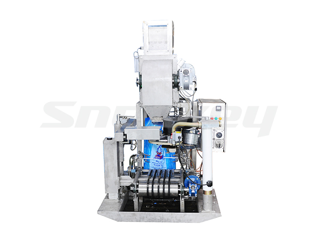 立式或卧式的转鼓上有一定范围可调的装冰空间。按体积计量,可根据冰型的不同调整体积,以达到重量相当的目的。入料斗满冰信号自动计量(排冰次数),用空气自动张袋口。人工提供下一包装信号,也可与后续封袋机构联动控制包装动作。